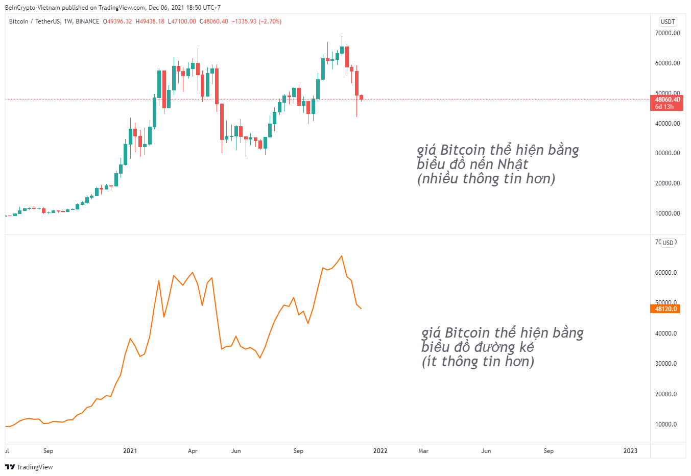 Như ví dụ trên hình, có thể thấy biểu đồ nến Nhật về trực quan cho biết nhiều thông tin quan trọng trong biến động giá hơn biểu đồ đường kẻ truyền thống phương Tây.