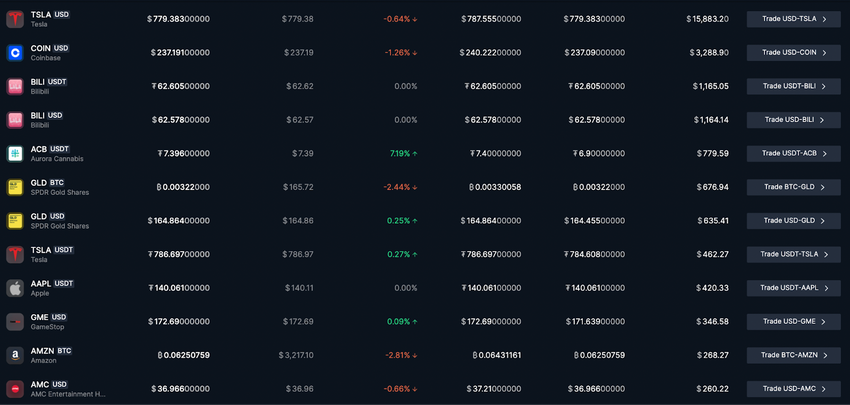 Trên sàn Bittrex, bạn sẽ tìm thấy hơn 700 cổ phiếu được mã hóa. Tất cả đều được niêm yết trên NYSE hoặc NASDAQ. Bao gồm các cổ phiếu lớn như Tesla, Coinbase, Apple, Amazon, Facebook, GameStop….