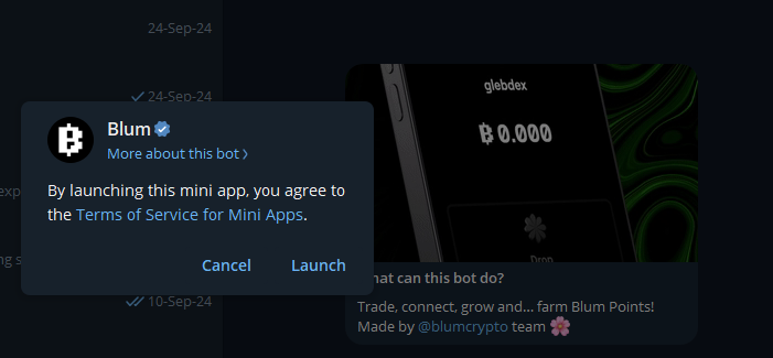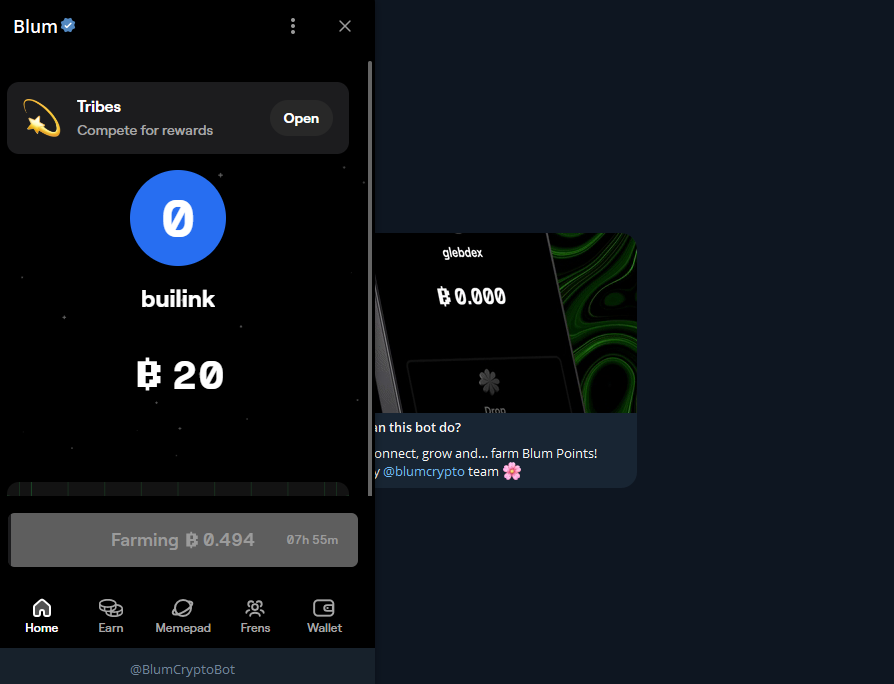 Như BeInCrypto đã trao đổi ở trên, phiên bản mini app trên Telegram của Blum có tên Blum Crypto bot. Đây được xem như là điểm tương tác ban đầu để người dùng có thể sử dụng Blum. Tại thời điểm BeInCrypto viết bài này, Blum đang triển khai Blum Points. Đây được xem như một cách điểm danh và thưởng điểm cho người dùng khi họ truy cập vào ứng dụng hàng ngày. Ngoài việc điểm danh, người dùng có thể kiếm (farm) Blum Point (BP) sau mỗi 8 giờ. Cơ chế farm này có phần tương tự như cách điểm danh hàng ngày mà chúng ta đã thấy trên Pi Network.
