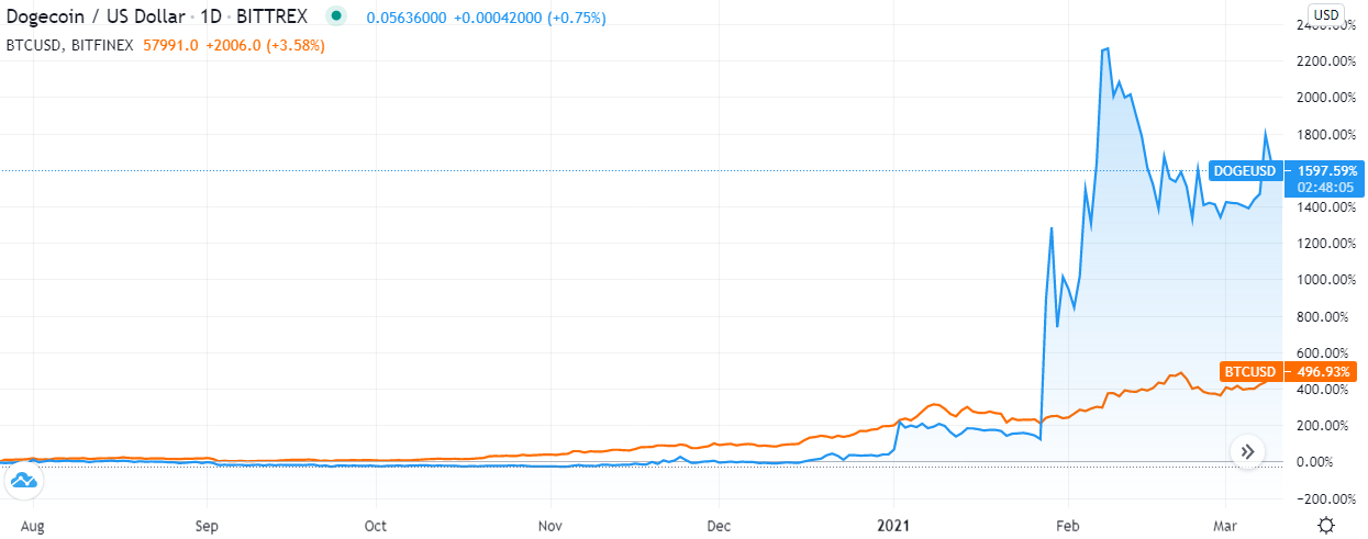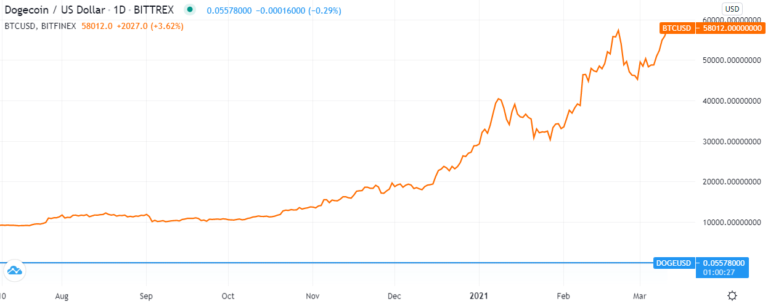Như bạn thấy trong đồ thị trên. Cả hai BTC và DOGE đều tăng rất mạnh. BTC tăng tiếp tục từ 40k đô la lên trên mức 50k đô la. Và thời điểm kích thích cho đợt tăng đó, là Musk thông báo mua BTC số lượng lớn ngày 8 tháng 2.