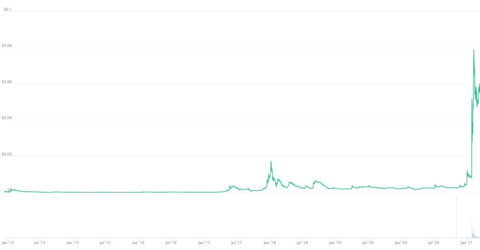- Giai đoạn đầu năm 2021: Nhờ có những cú tweet của Elon Musk mà giá của DOGE đã đạt đến mức không ai ngờ tới. Đó là 0.083745 đô vào ngày 8 tháng 2 năm 2021.