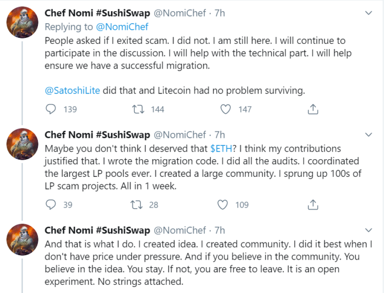 Đó chính là những gì mà Chef Nomi – Founder của Sushi Swap đã làm. Và đã kiếm được 13 triệu đô la ETH trong quá trình giá SUSHI giảm. Công bằng mà nói, sau đó Cheft Nomi đã trả lại số tiền và giá sau đó đã phục hồi tốt. Chủ yếu cũng là nhờ sản phẩm có tiếng.