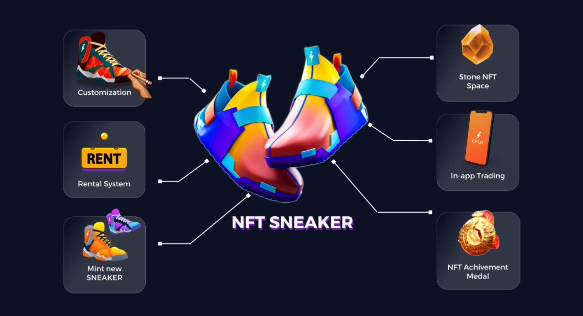 - Hệ sinh thái NFT sneaker: Calo metaverse xây dựng hệ thống NFT Sneaker và tạo gameplay xung quanh chúng. NFT sneaker system sẽ có 4 loại giày khác nhau gồm Walker, Runner, Jogger và Trainer. Tương tự như StepN, các đôi giày này cũng có các thuộc tính về cấp độ, số lần mint, performance, tốc độ hay khả năng phục hồi…
