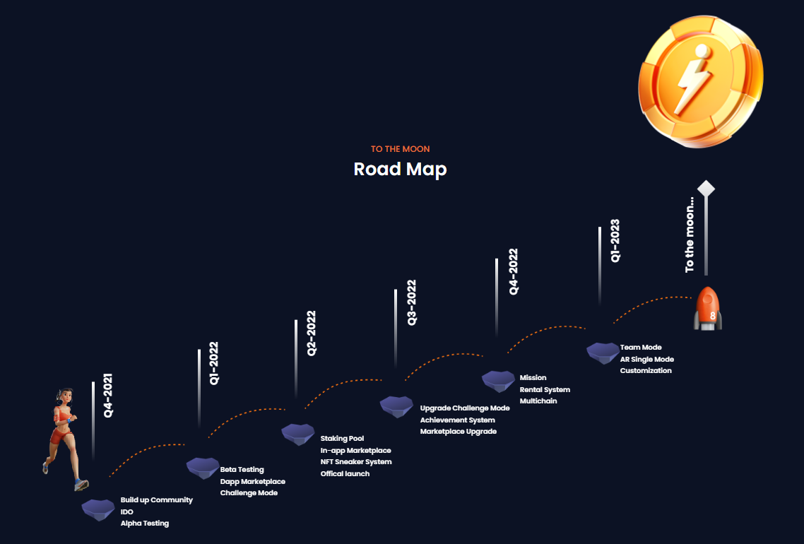 Tính đến thời điểm hiện tại (Q2/2022), theo dự kiến thì dự án sẽ hoàn thiện staking pool, in-app marketplace và chính thức ra mắt NFT sneaker system. Theo ghi nhận của BeInCrypto, hiện tại NFT sneaker system đã ra mắt với 4 loại giày khác nhau gồm Walker, Runner, Jogger và Trainer. Người dùng sẽ cần đến token FIT để giao dịch các loại giày này trên marketplace.
