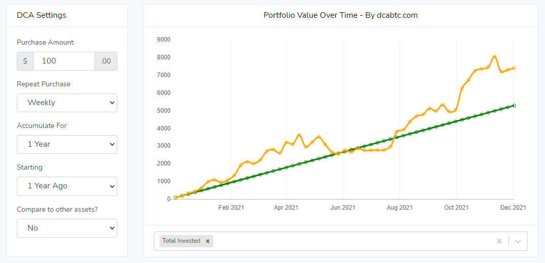 Giả sử bạn chỉ là một nhà đầu tư cá nhân với số vốn ít. Bạn quyết định mỗi tuần bỏ ra 100 USD mua Bitcoin và làm liên tục như thế trong suốt một năm vừa qua. Sau đây sẽ là kết quả bạn đạt được (đường màu xanh là tổng tiền đầu tư, đường màu cam là tổng tiền thu về).