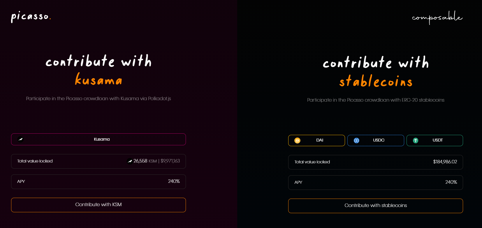 - On-chain: Trực tiếp thông qua Polkadot.js GUI, người dùng sẽ đóng góp trực tiếp trên chuỗi bằng GUI của Polkadot. Hoặc người dùng có thể tham gia thông qua trang dashboard tùy chỉnh được tạo bởi dự án parachain.