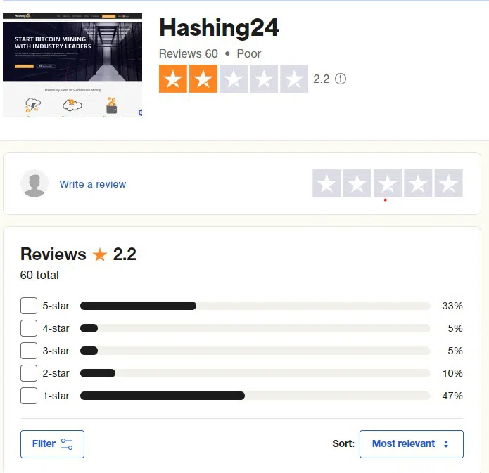 Khi nói đến sự hài lòng của khách hàng, đã có nhiều ý kiến trái chiều về trải nghiệm người dùng trên Hashing24. Nhiều đánh giá cho biết lợi nhuận giảm dần, không phản hồi và thiếu minh bạch. Nhìn chung, Hashing24 có xu hướng nhận được đánh giá kém từ khách hàng. Nền tảng này đạt điểm trung bình chỉ 2.2/5 trên TrustPilot, với tổng số 60 đánh giá được tổng hợp lại.