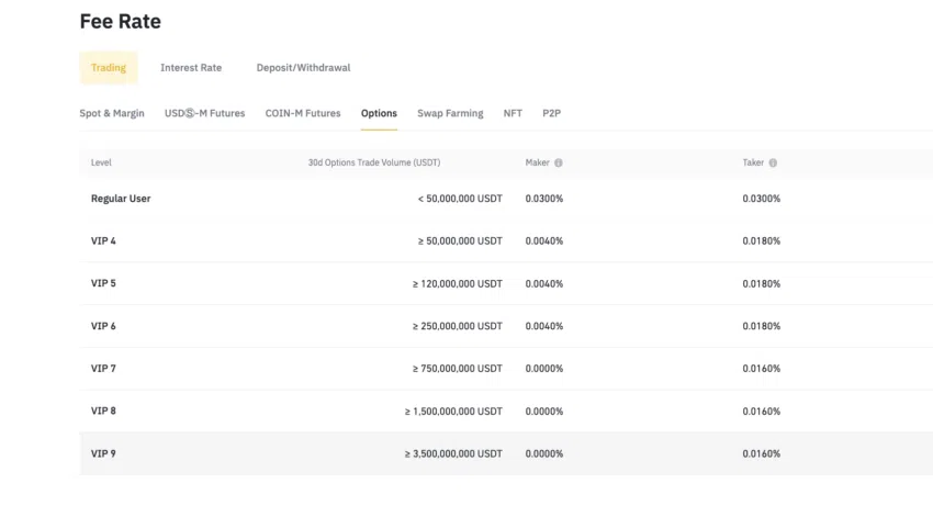 Đối với quyền chọn kiểu Châu Âu, người dùng thông thường phải trả 0.03%, với tư cách là maker và taker. Ngoài các cấu trúc phí này, Binance còn có các cấp độ cho hoạt động canh tác hoán đổi, giao dịch NFT và giao dịch P2P.