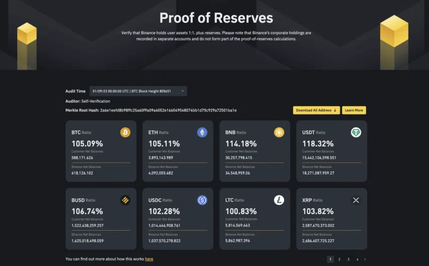 Binance được đánh giá là một trong những sàn giao dịch lớn và đáng tin cậy. Theo bảng xếp hạng các sàn giao dịch của CoinGecko, nó đạt điểm 9 hoàn hảo. Binance là một trong số ít sàn giao dịch đầu tiên xuất bản bằng chứng dự trữ dựa trên Merkle Tree với cơ chế tự kiểm tra và cập nhật. Như bạn có thể thấy, hầu hết các tài sản đều được thế chấp quá mức.