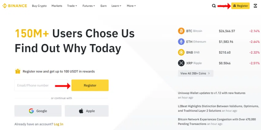 - Để bắt đầu, hãy truy cập trang web Binance và chọn “Đăng ký”.