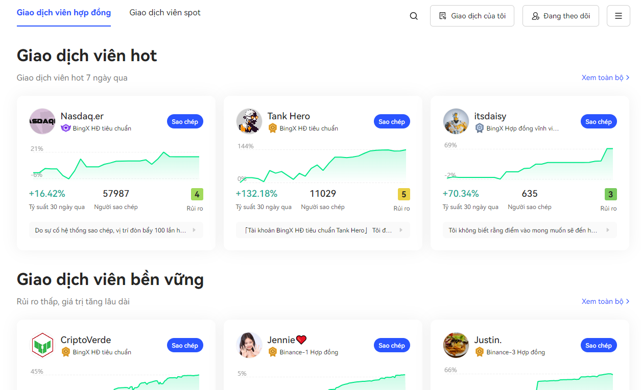 - Copy trading: Là hình thức sao chép lại các giao dịch của các nhà đầu tư thành công trong mạng lưới của BingX. Có nhiều hình thức khác nhau để người dùng có thể lựa chọn dựa trên các gợi ý của BingX như các nhà giao dịch đang lên “trending” hay dựa trên mức độ hiệu quả của từng người. Bạn có thể chọn từ các nhà giao dịch tương lai và spot grid. Thậm chí, nếu bạn có thành tích tốt, bạn thậm chí có thể đăng ký để trở thành một trong số những nhà giao dịch về copy trading này. Theo ghi nhận của BeInCrypto, nền tảng này hiện có hơn 20,000 nhà giao dịch chuyên nghiệp với hơn 130 triệu lệnh copy đã được tạo ra.