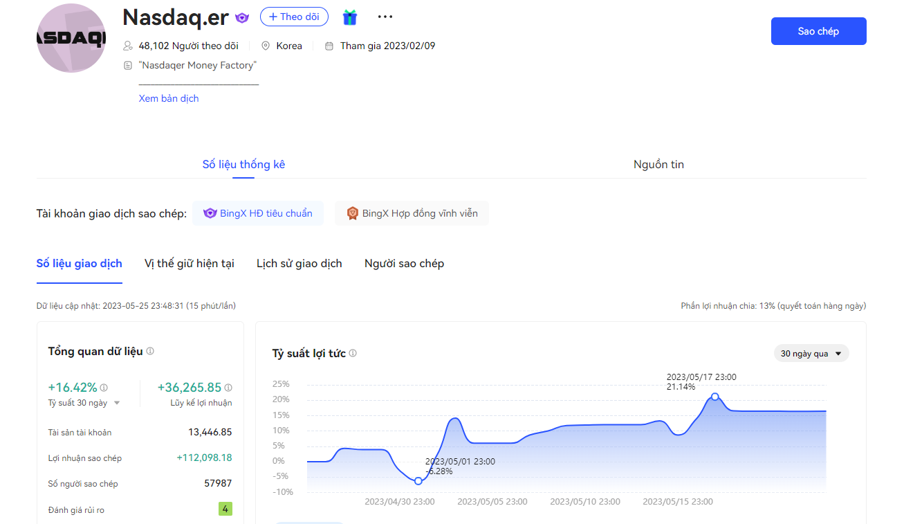 - Ở góc độ người copy giao dịch, dựa trên dữ liệu phân cấp từ các nhà giao dịch tiềm năng, BingX liên tục đưa ra các gợi ý cho người dùng. Với nhiều lựa chọn khác nhau phù hợp với tâm lý của từng nhóm các nhà đầu tư, không khó để bạn có thể tìm kiếm cho mình một nhà giao dịch phù hợp để theo dõi. Ngoài ra, BingX còn xây dựng một “mạng xã hội” thu nhỏ, cho phép người dùng có thể cập nhật những chiến lược đầu tư từ chính những nhà giao dịch mà mình quan tâm. Bằng cách tạo ra sự tương tác giữa các bên giúp xóa mờ khoảng cách, gia tăng sự tin tưởng của người dùng đối với nền tảng.