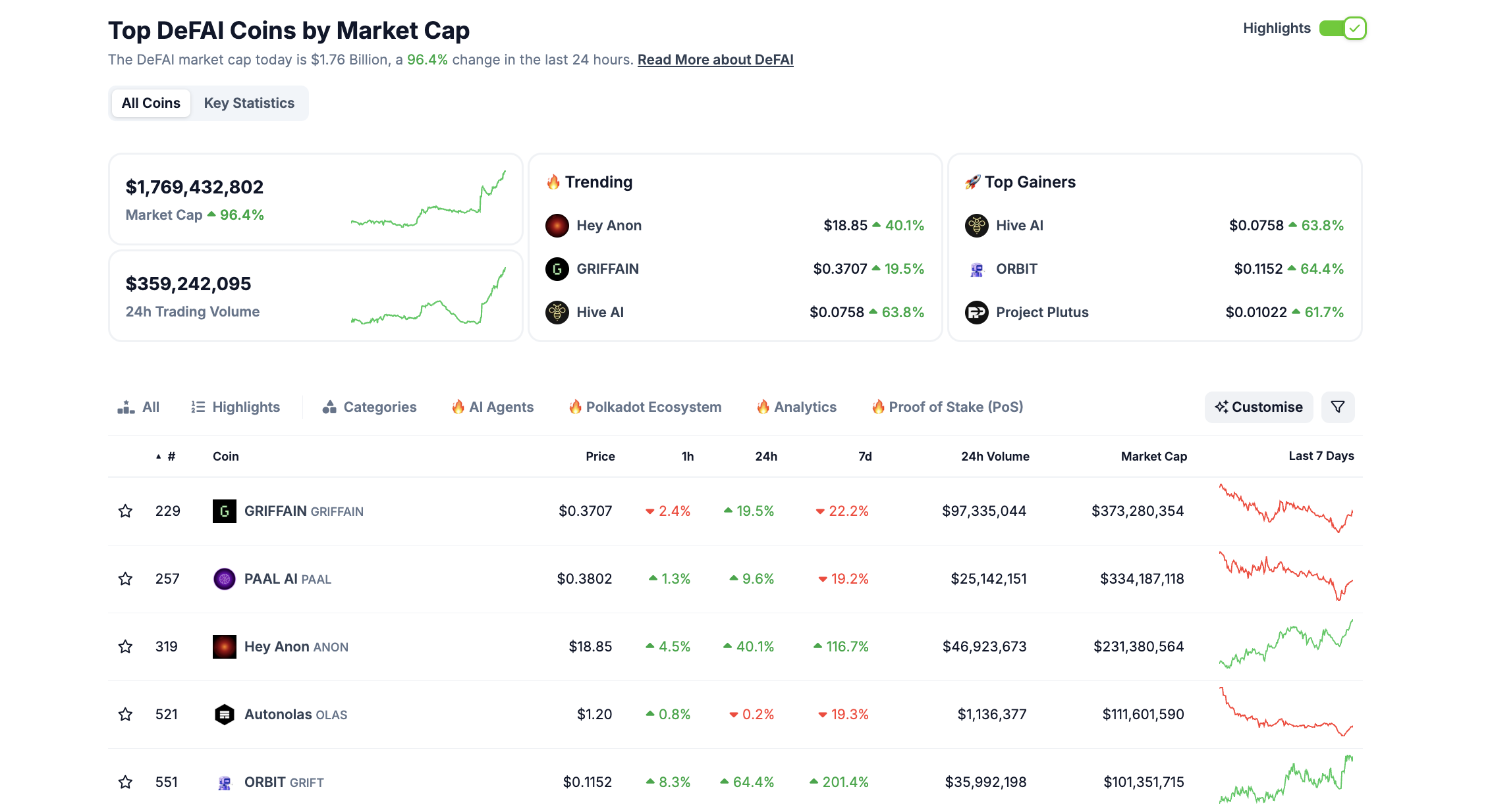 Tại thời điểm BeInCrypto thực hiện bài viết này, dữ liệu từ nền tảng CoinGecko cho thấy quy mô thị trường của DeFAI đã đạt gần 1.8 tỷ USD. Mặc dù vẫn đang trong giai đoạn đầu so với thị trường AI Agent, hiện được định giá 13.2 tỷ USD nhưng DeFAI cũng đã và đang cho thấy một tốc độ phát triển nhanh chóng.