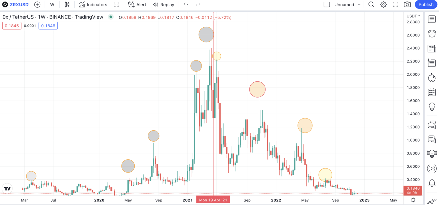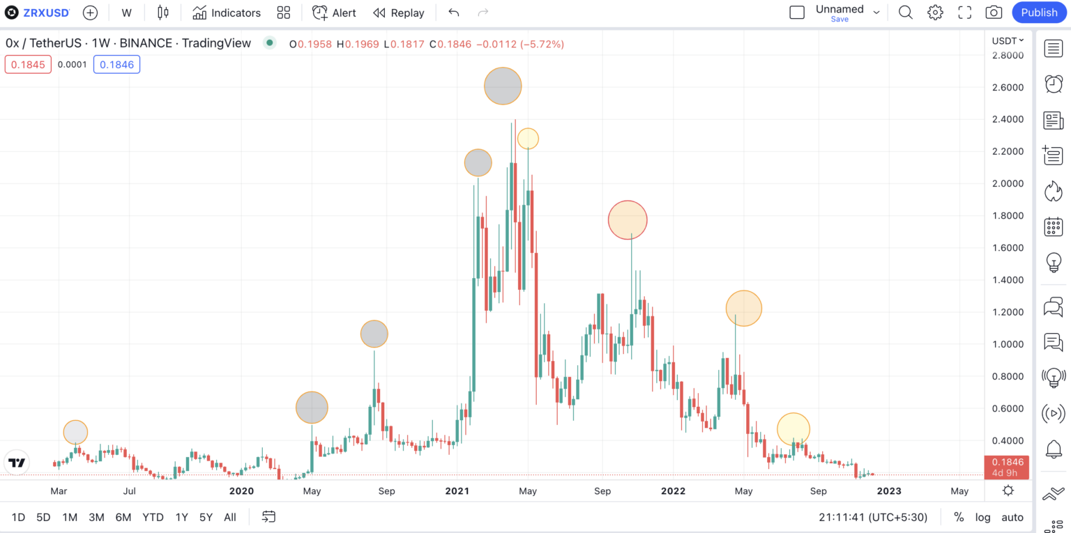 Bây giờ, hãy phân tích biểu đồ giá ZRX trên khung tuần và bắt đầu dự đoán xu hướng là tăng hay giảm: