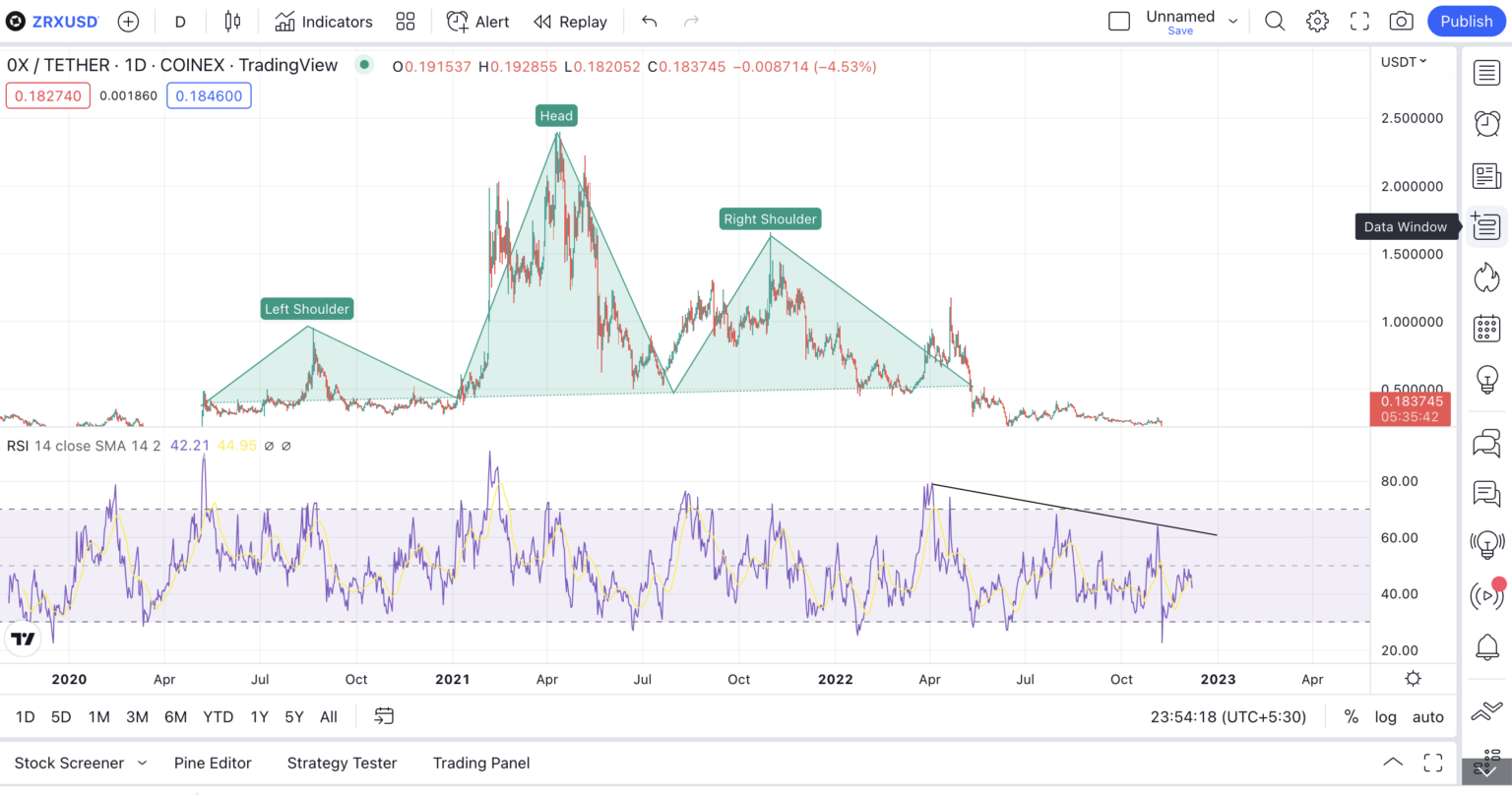 Trên biểu đồ ngày, ZRX hình thành mô hình vai đầu vai rõ ràng với một sự cố đi xuống. Ngay cả chỉ báo RSI (chỉ báo động lượng) cũng đang dốc xuống và xu hướng giá trước mắt có vẻ không mạnh mẽ.