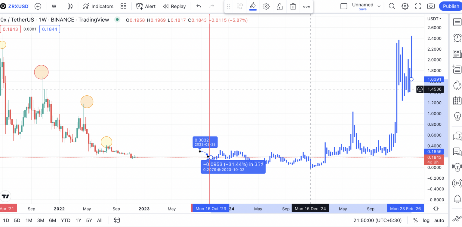 Chúng ta có điểm đầu tiên của một mô hình sắp tới, 0.2969 USD (vào ngày 6 tháng 11 năm 2023). Bây giờ, hãy so sánh tương tự với mô hình đầu tiên và vẽ biểu đồ hành động giá dài hạn của ZRX.