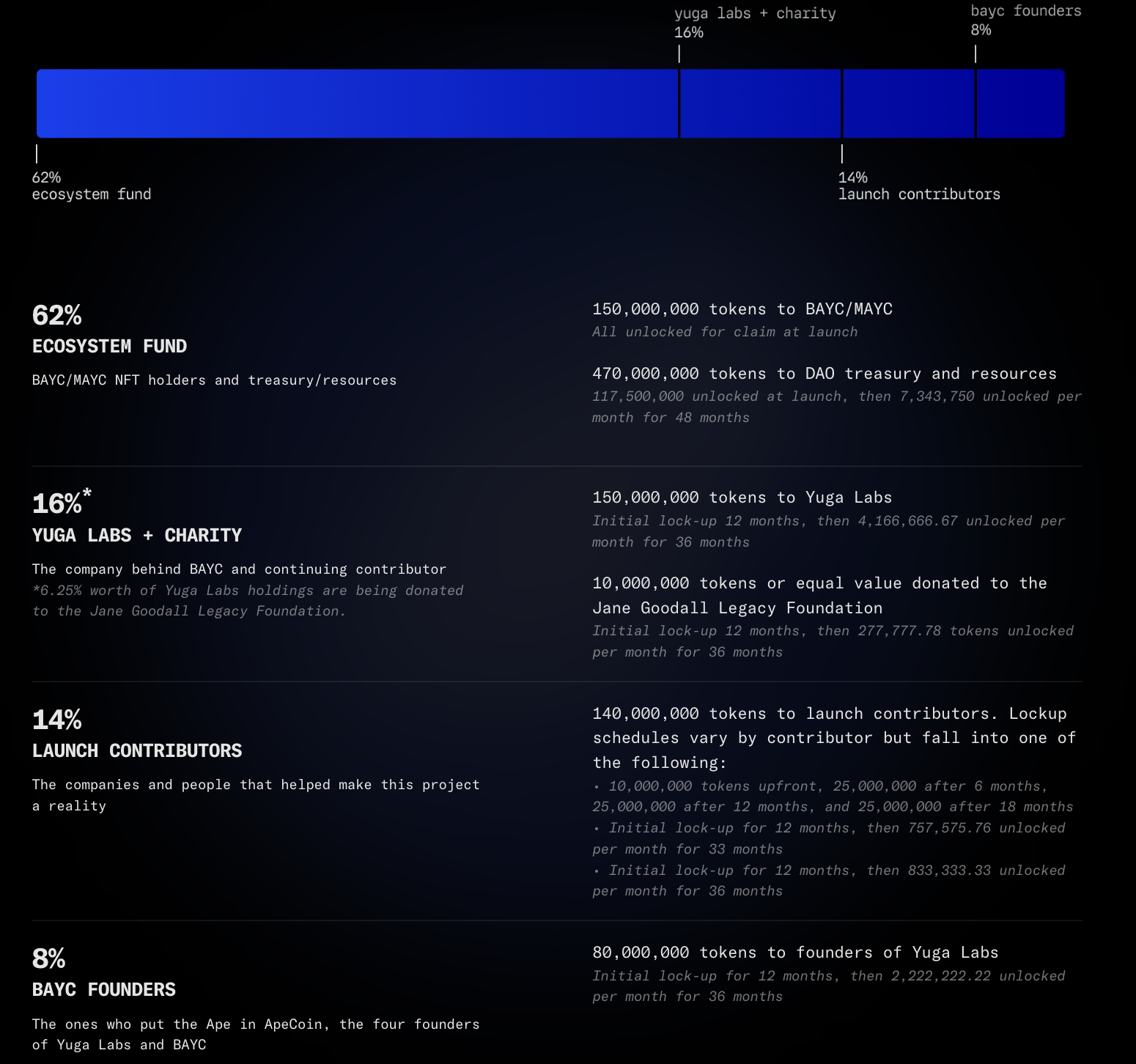 Nếu nhìn vào các số liệu phân phối cụ thể hơn, bạn sẽ thấy có 62% là tổng nguồn cung của quỹ hệ sinh thái. Các token này được mở khóa khi dự án ra mắt và dành cho chủ sở hữu NFT và kho bạc. 16% còn lại dành cho Yuga Labs và tổ chức từ thiện nhưng với đợt mở khoá đầu tiên là sau 12 tháng và các đợt mở khoá tiếp theo là trong 36 tháng.