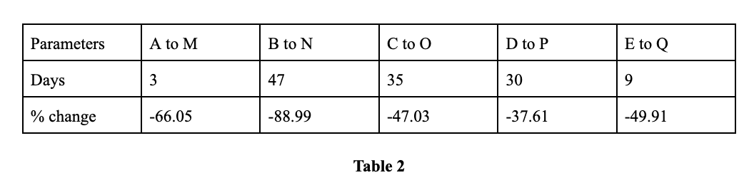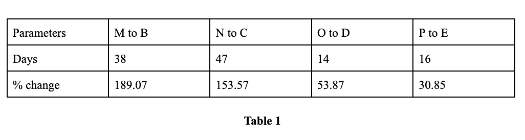 Khoảng cách và mức thay đổi giá trung bình từ thấp đến cao là: 29 ngày (tối đa là 47 ngày) và 106.84%. Khoảng cách có thể thay đổi vì không có nhiều dữ liệu lịch sử của giá APE. Thêm vào đó, thị trường tiền điện tử hiện tại vẫn đang trong xu hướng giảm. Tổng khoảng cách từ M đến E là 115 ngày, đây cũng có thể là nơi đỉnh tiếp theo xuất hiện.