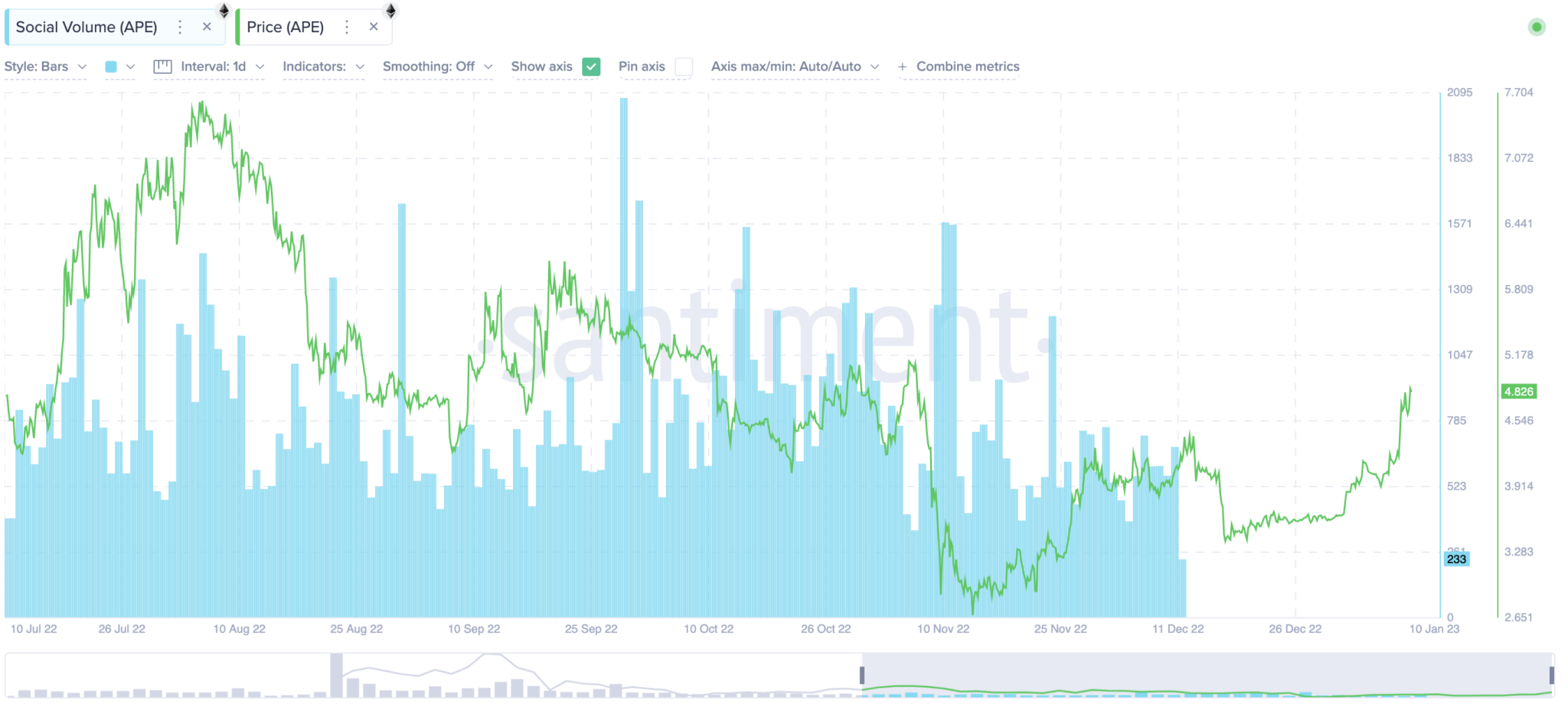 Kể từ đầu tháng 12/2022, khối lượng mạng xã hội ổn định đã đẩy giá cao hơn. Tính năng staking được tung ra gần đây đã khiến số lượng các cuộc trò chuyện liên quan đến ApeCoin tăng lên. Và điều này có thể thúc đẩy giá APE thể tiếp tục tăng cao hơn trong thời gian tới.