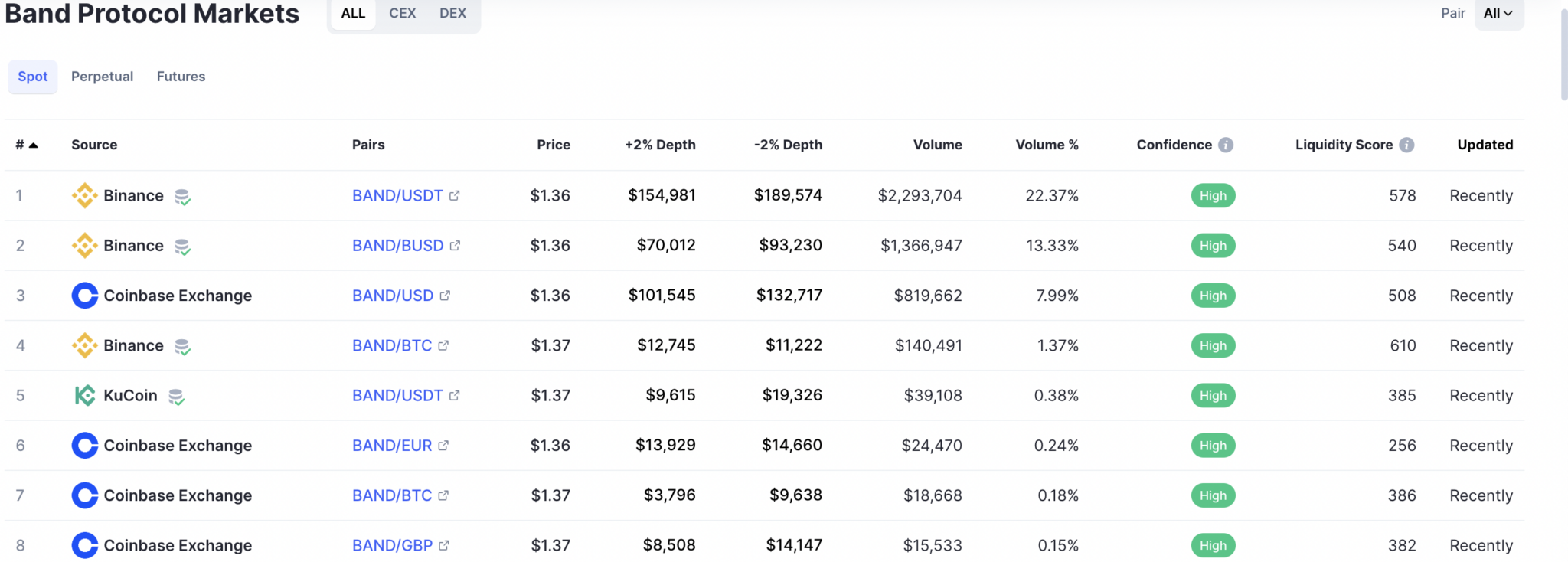 Về khối lượng giao dịch, mức spread trên thị trường giao ngay của BAND là khá tốt. Hầu hết các sàn giao dịch phổ biến đều niêm yết BAND. Tuy nhiên, các cặp BAND/USDT và BAND/BUSD trên sàn Binance thống trị phần lớn khối lượng giao dịch và thanh khoản.
