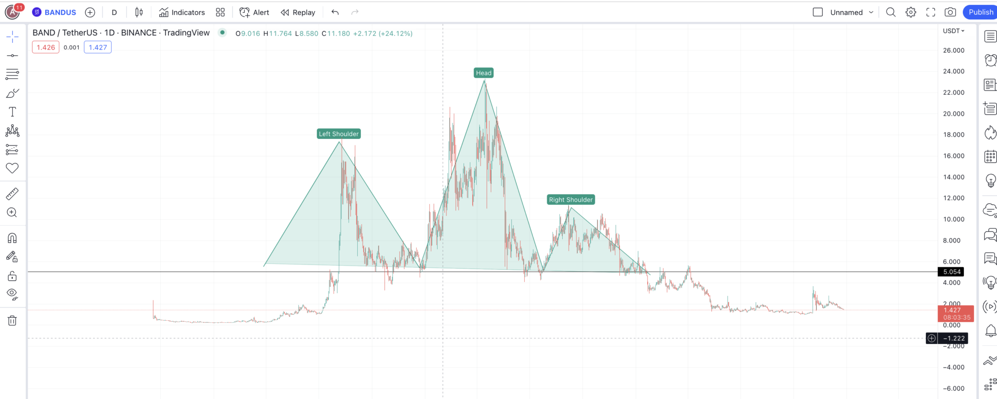 Trước khi bắt đầu phân tích kỹ thuật, hãy cùng quan sát biểu đồ giá BAND trên khung thời gian ngày. Theo đó, giá đang hình thành mô hình “Đầu và Vai”.