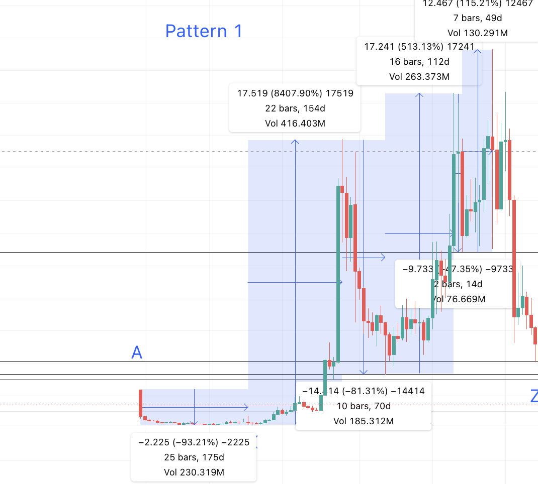 Nếu biểu đồ giá của BAND tuân theo khái niệm về mô hình Foldback, thì khi kết thúc Mẫu 2, Mẫu 1 có thể sẽ lặp lại. Bây giờ, chúng ta hãy tìm khoảng cách và phần trăm thay đổi giá giữa tất cả các đỉnh cao hơn trong Mẫu 1 và các đỉnh thấp hơn trong Mẫu 2.