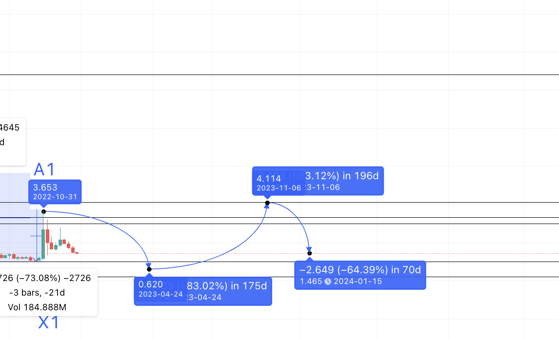 Bây giờ, nếu lấy giá trị trung bình của các điểm tương ứng trên các mẫu, chúng ta có thể tính toán được các mức thấp mới, X2, sau A1. Giả sử đó là một mẫu mới, A1 và A2 bắt đầu từ cùng một điểm. Theo đó, X2 cách A1 khoảng cách trung bình là 98 ngày (tối đa 175 ngày) và ở mức thấp là 83.4%, tại 0.620 USD. Chúng ta có thể đánh dấu điểm này là X2.