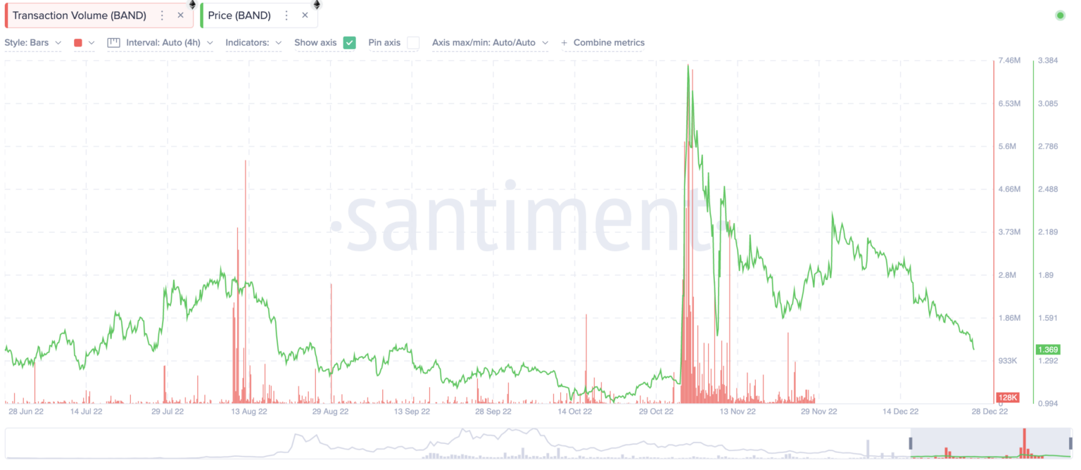 - Ở thời điểm hiện tại, kể từ ngày 28/12/2022, BAND có khối lượng giao dịch là 14.81 triệu USD và vốn hóa thị trường là 48.25 triệu USD. Tỷ lệ turn-over là 0.30. Theo đó, biến động giá BAND đang ở mức khá cao. Đây là lý do tại sao bất kỳ tài sản kỹ thuật số nào cũng cần phải có khối lượng giao dịch.