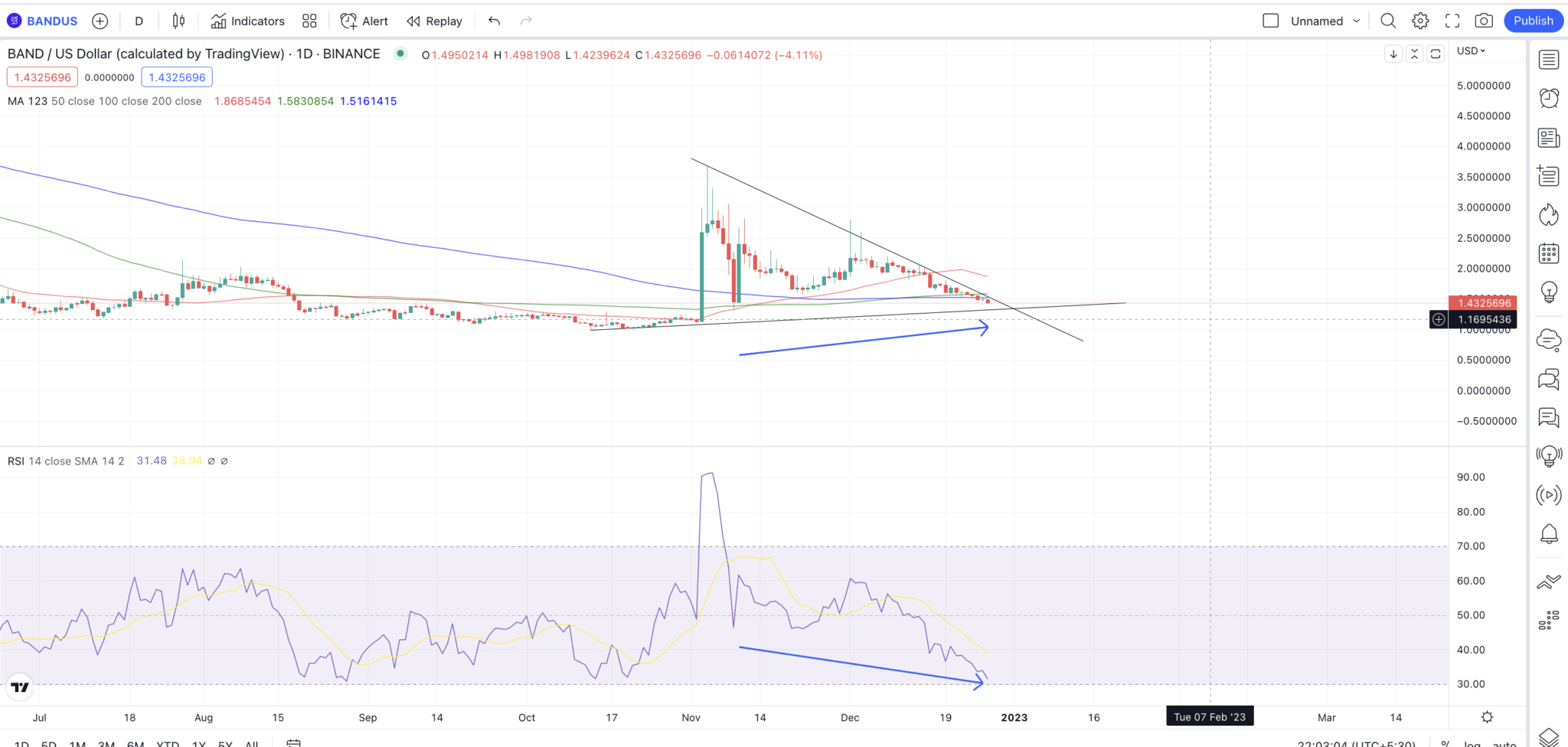 Bây giờ, chúng ta hãy nhìn vào biểu đồ trên khung dài hạn hơn và phân tích xem giá BAND có đang di chuyển theo một mô hình nào không.