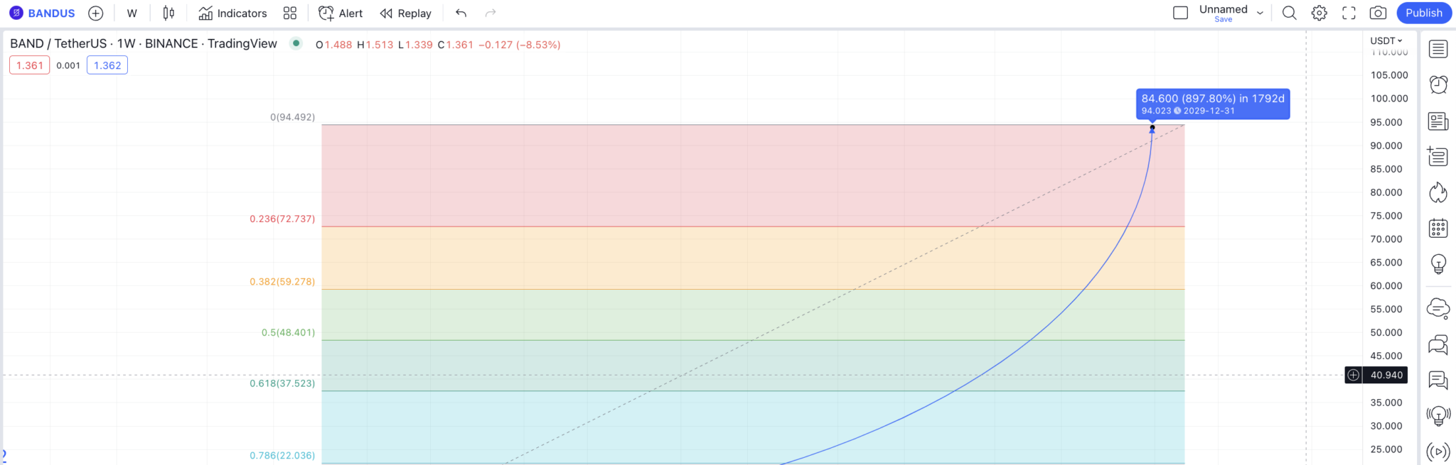 Theo Fib mở rộng, giá BAND có thể đạt mức 94.023 USD vào năm 2030. Tuy nhiên, để giữ vững được các mức Fib này, BAND phải vượt qua mốc 37 USD vào giữa năm 2028. Ngoài ra, mức thấp nhất vào năm 2030 có thể nằm ở 53.20 USD, trùng với mức Fib 61.8% khi đo từ năm 2030 đến năm 2025.