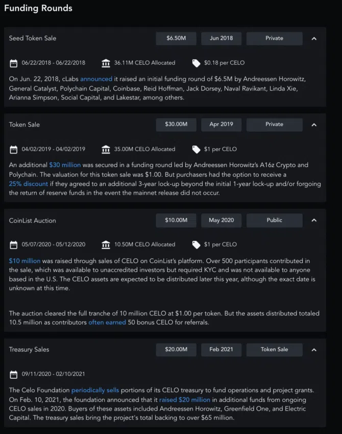 CELO có nguồn cung tối đa là 1 tỷ mã thông báo. Trong đó, 600 triệu mã thông báo đã niêm yết như một phần của việc ra mắt mainnet. Ngoài ra, dự án có một số vòng gọi vốn trong gian đoạn ban đầu. Dưới đây là một số thông tin về các đợt huy động vốn: