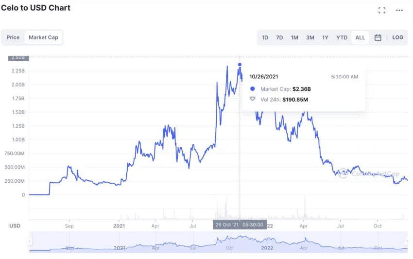 Vốn hóa thị trường của CELO đạt đỉnh vào ngày 26/10/2021. Mức ATH của vốn hóa CELO là 2.36 tỷ USD với khối lượng giao dịch là 190.85 triệu USD. Từ đó suy ra tỷ lệ doanh thu là 0.08. Vốn hóa thị trường tại thời điểm BeInCrypto viết bài này ở mức 254.68 triệu USD, trong khi khối lượng giao dịch hàng ngày hiện ở mức 8,39 USD. Tỷ lệ doanh thu hiện tại là 0.03.