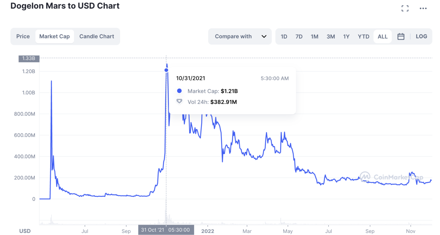Theo lịch sử phát triển, vốn hóa thị trường của Dogelon Mars đã giảm đáng kể từ mức cao nhất vào tháng 10/2021 là 1.21 tỷ USD. Tuy nhiên, mức hiện tại vẫn cao hơn nhiều so với mức đáy của dự án tại thời điểm vài tháng sau khi ra mắt token.