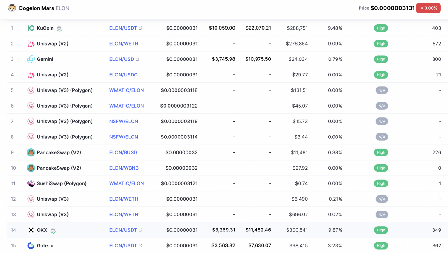 Đồng memecoin này có mức chênh lệch (spread) giao dịch khá ổn định. Điều này cho thấy độ tin cậy và triển vọng lâu dài của dự án. Mặc dù là một memecoin, Dogelon vẫn được niêm yết trên nhiều sàn giao dịch. Dưới đây là danh sách 15 sàn giao dịch tập trung và phi tập trung hàng đầu nơi bạn có thể giao dịch các cặp ELON.