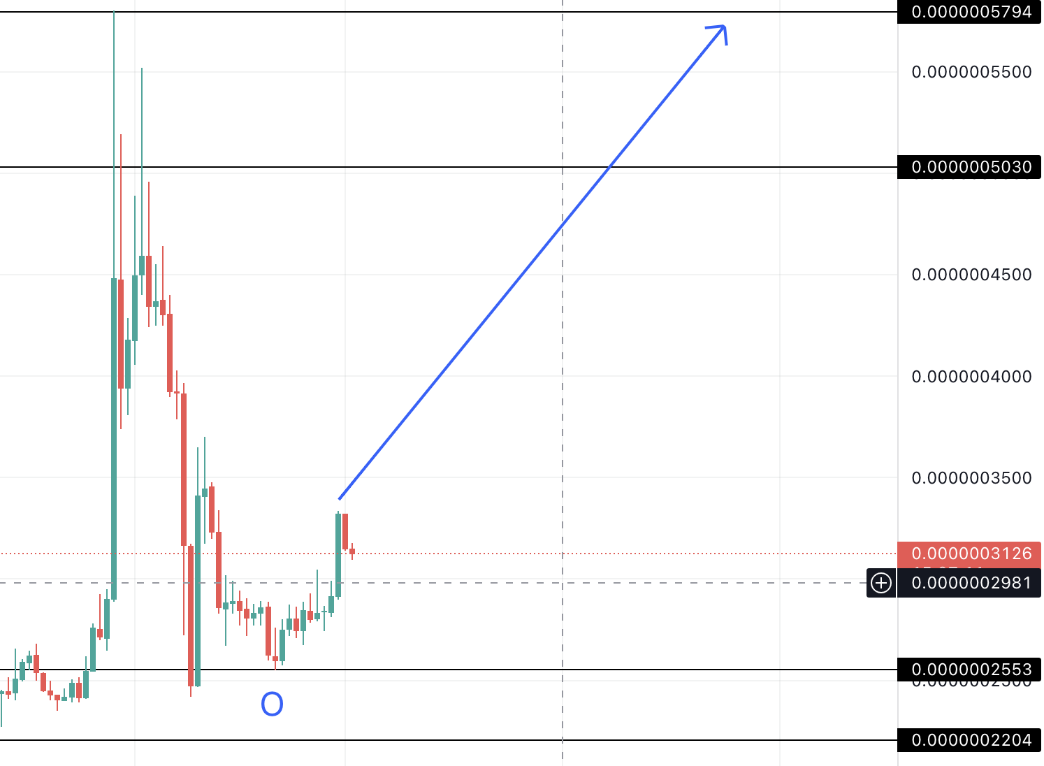 Do đó, nếu mức thấp nhất của chu kỳ này là 0.0000002553 USD, lập được vào ngày 21/11, được ký hiệu là O, thì mức cao tiếp theo có thể là vào ngày 27/1/2023, tại 0.0000005795 USD.
