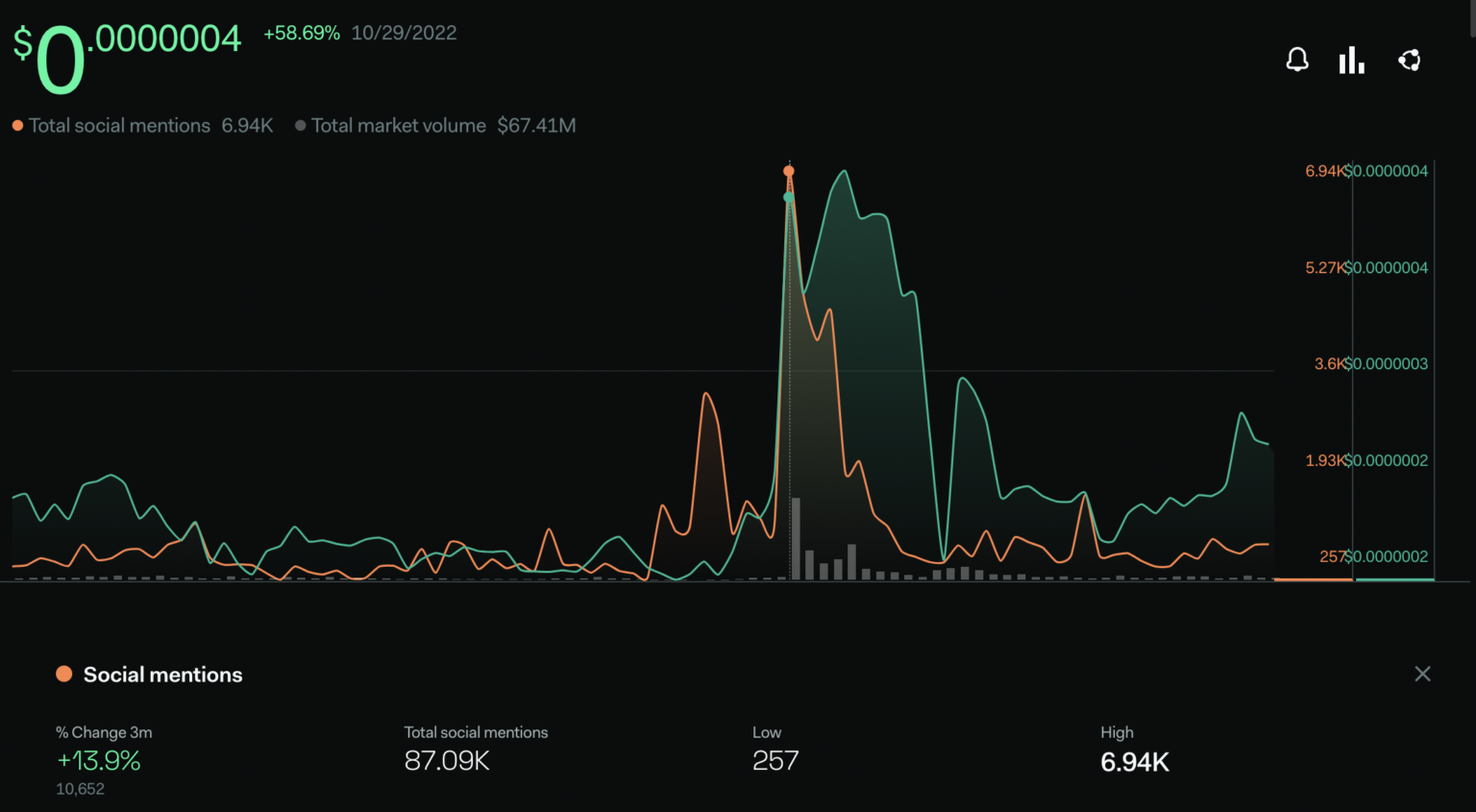 Giá của token ELON phản ứng tích cực với các chỉ số mạng xã hội. Theo đó, giá ELON có mối tương quan trực tiếp đến mức độ phổ biến của dự án trên các mạng xã hội. Các lượt đề cập đến ELON cũng như Dogelon Mars đã tăng vọt quanh ngày 27/10/2022, khi Elon Musk chính thức tiếp quản Twitter.