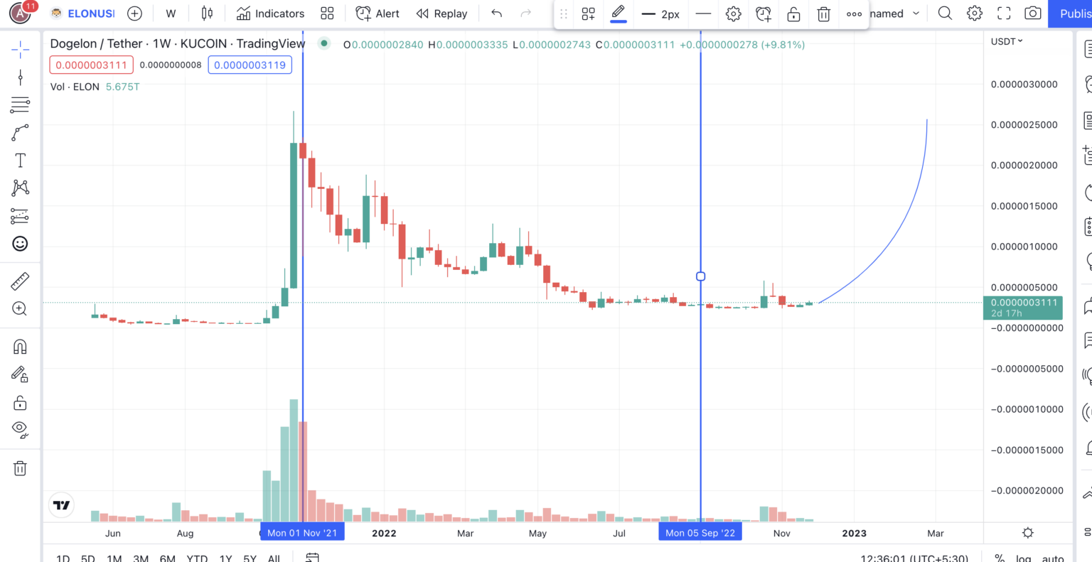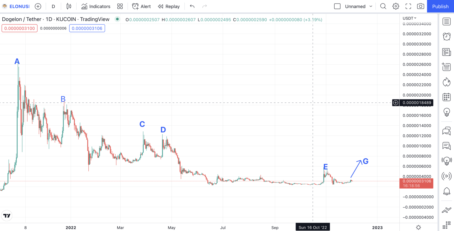 Dưới đây là biểu đồ giá Dogelon Mars và phân tích kỹ thuật của nó trên khung tuần. Trước hết, hãy xem xét toàn cảnh về hành động giá.
