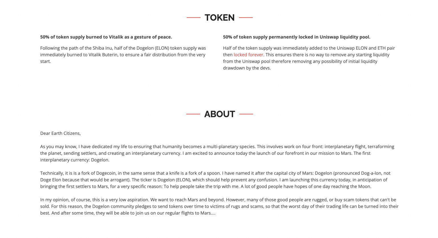 Dogelon Mars đã chuyển token ELON và 40 ETH sang nhóm thanh khoản Uniswap để duy trì số dư và tính thanh khoản của nhóm. Đổi lại, họ nhận được token của nhà cung cấp thanh khoản (LP token). Tuy nhiên, cộng đồng Dogelon đã chọn đốt các token LP trong một cuộc đấu thầu để chứng minh rằng họ không làm dự án này chỉ để kiếm tiền một cách nhanh chóng. Theo đó, LP token giống như biên lai có thể được sử dụng để rút tiền của dự án. Sau khi đốt các token này, cộng đồng Dogelon Mars sẽ không còn có thể bỏ trốn bằng tiền của người dùng được nữa.