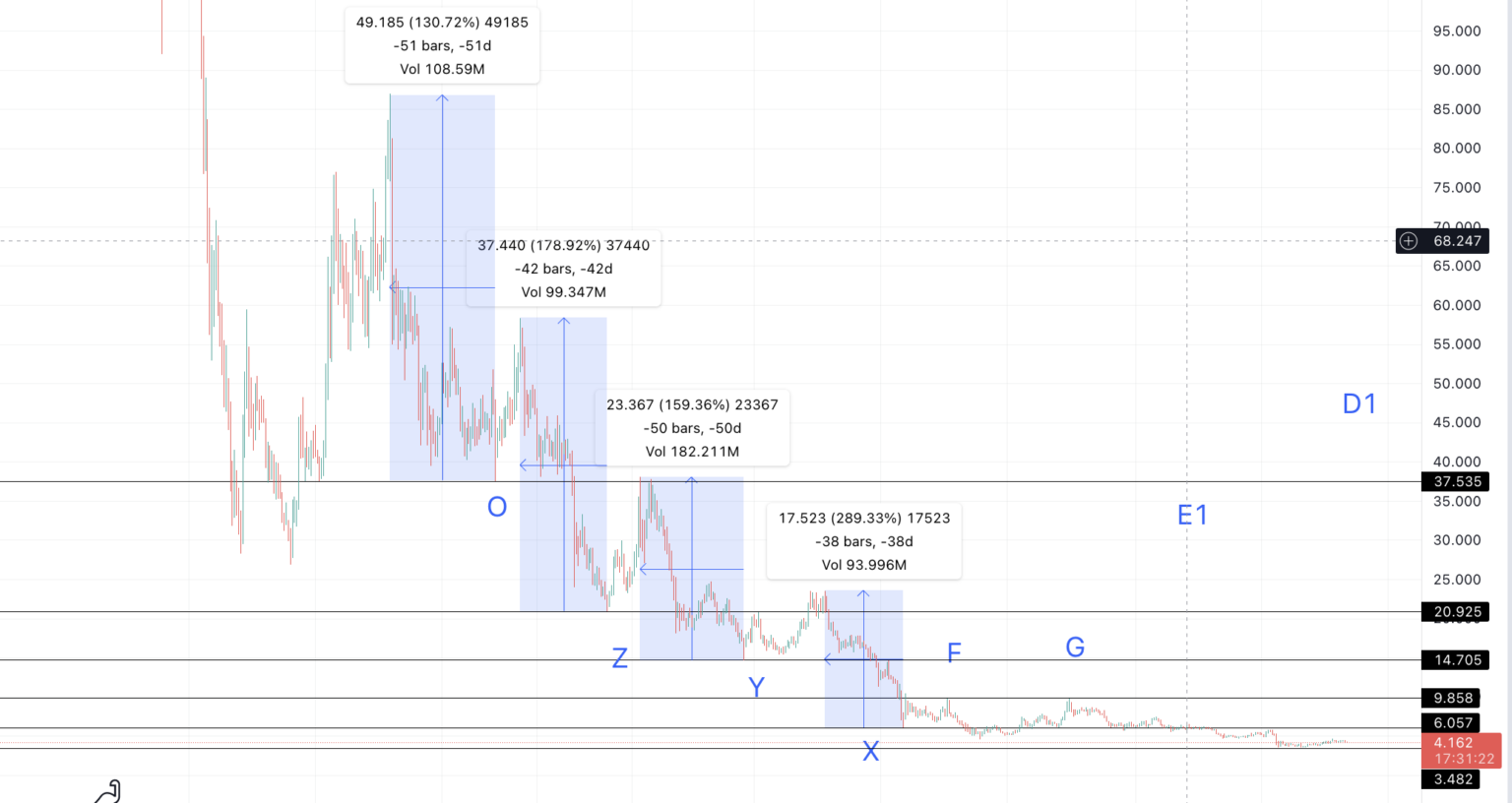 Bây giờ chúng ta hãy đánh dấu điểm thấp nhất giữa F và E là X. Theo đó, ICP mất 38 ngày và tăng 289.33% để giá đi từ X đến E.