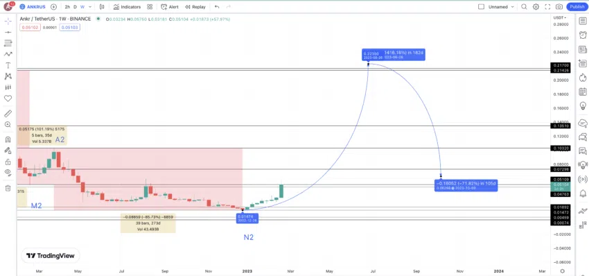 Tùy thuộc vào điều kiện thị trường hiện tại, mức thấp tiếp theo có thể giảm 71.70% (mức giảm giá trung bình). Điều này đặt giá tối thiểu của ANKR là 0.069 USD vào cuối năm 2023. Chúng tôi có thể đánh dấu mức này là M3.