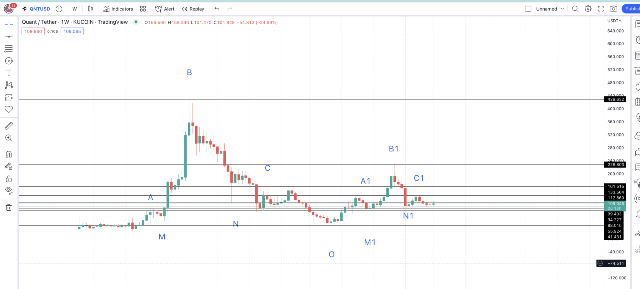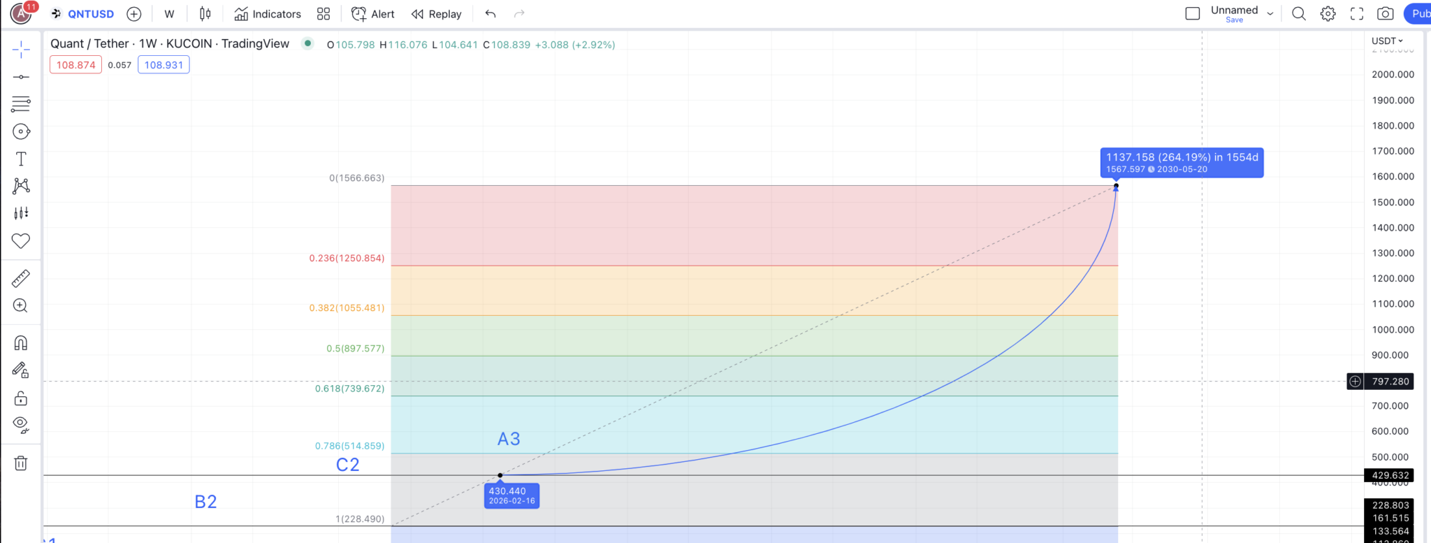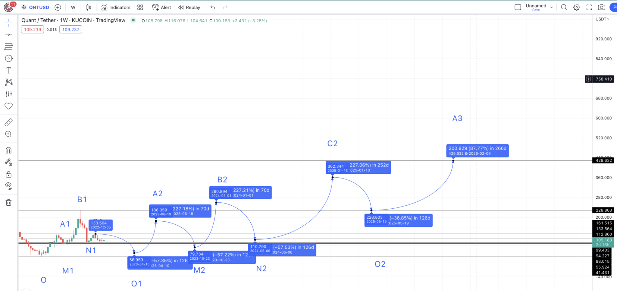 Với tỷ lệ phần trăm từ thấp đến cao là 226.98%, từ mức thấp dự kiến O1, giá của QNT có thể tăng lên tới 186.36 USD. Đây có thể là mức giá tối đa của QNT vào năm 2023. chúng ta có thể đánh dấu đây là A2.