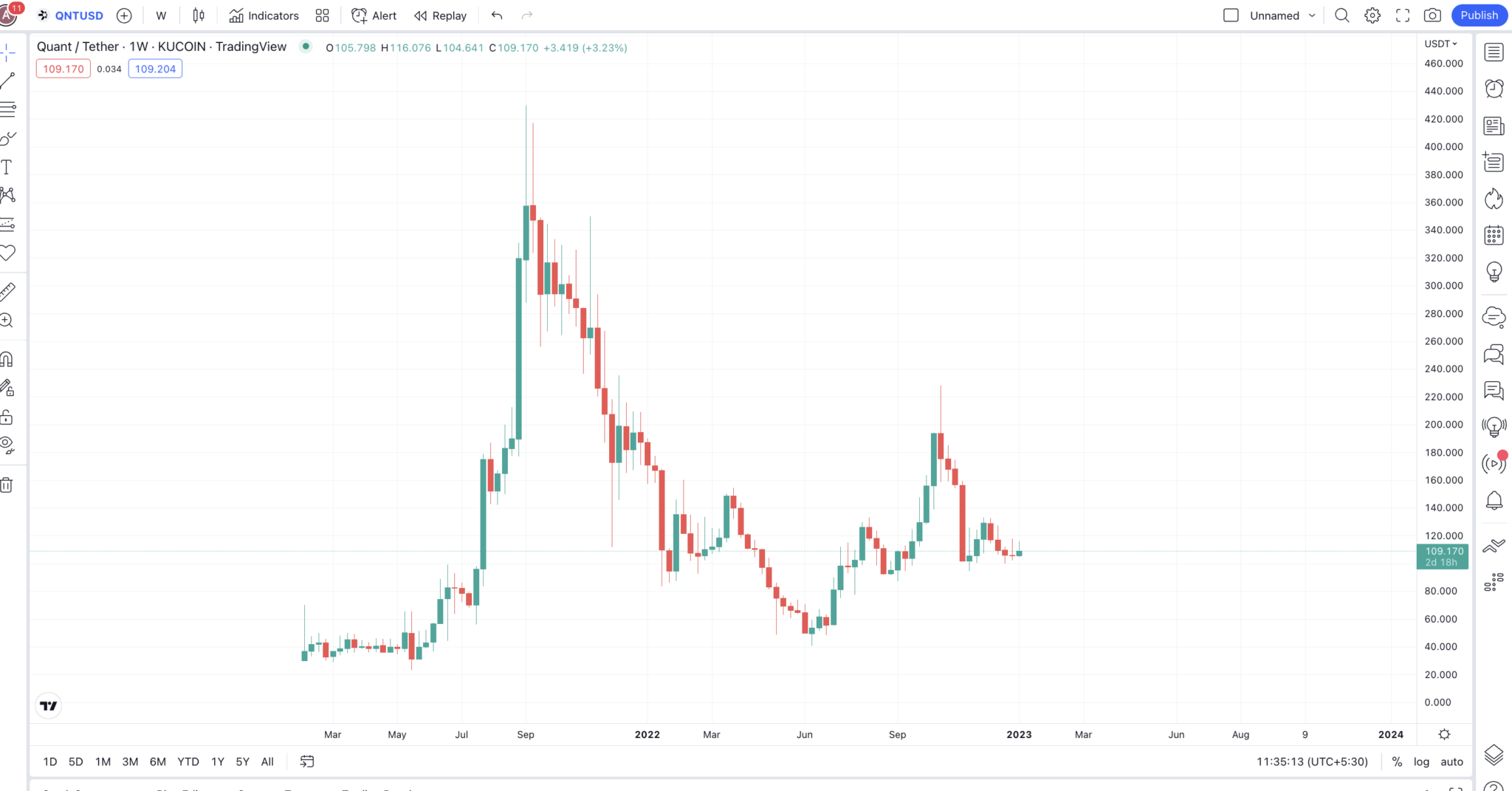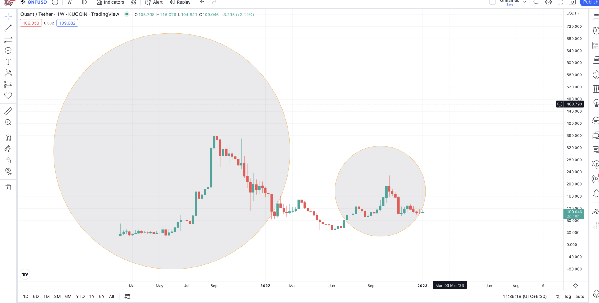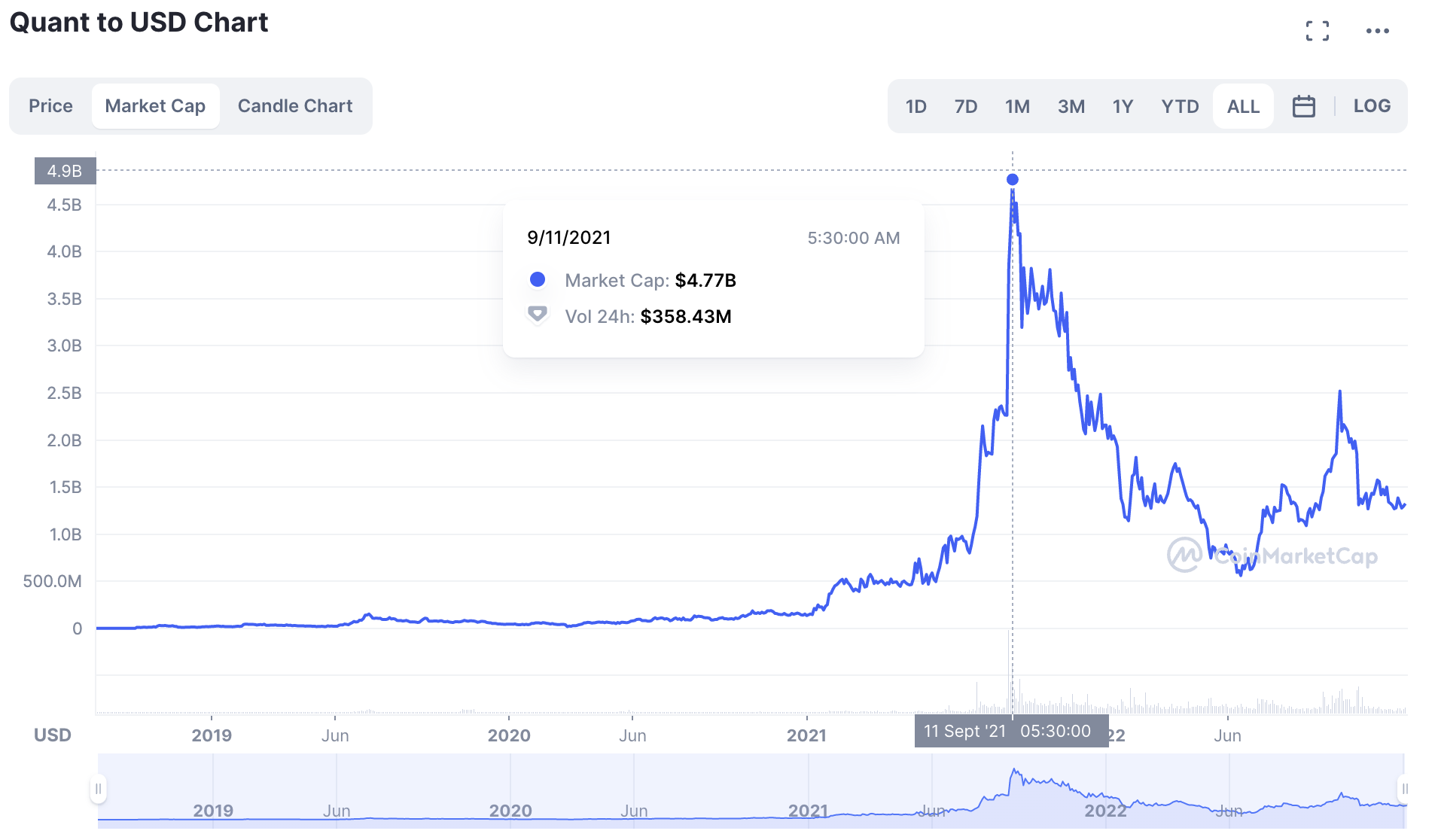 Nếu nhìn vào sự tăng trưởng vốn hóa thị trường của QNT, bạn có thể thấy đỉnh hình thành vào ngày 11/9/2021. QNT đạt vốn hóa thị trường cao nhất là 4.77 tỷ USD, với khối lượng giao dịch là 358.43 triệu USD. Tỷ lệ quay vòng (turn-over ratio) là 0.075.