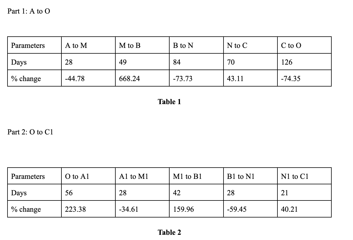 - Việc giảm từ A xuống M và A1 xuống M1 mất cùng số ngày và phần trăm thay đổi không quá khác biệt. Do đó, chúng ta có thể áp dụng các mức này để dự đoán giá Quant trong mô hình tiếp theo.