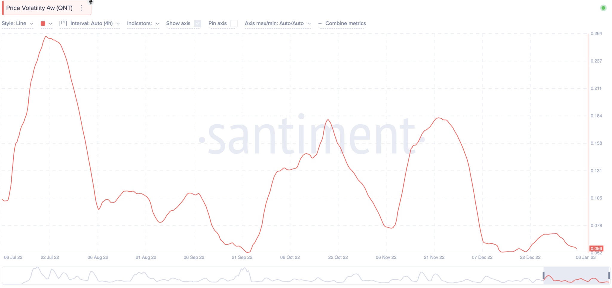 Biểu đồ biến động giá QNT trong 4 tuần cho thấy tính đến thời điểm hiện tại — đầu tháng 1/2023 — mức biến động của QNT là thấp nhất kể từ tháng Bảy. Đây là thông tin tốt cho hành động giá ngắn hạn của QNT.