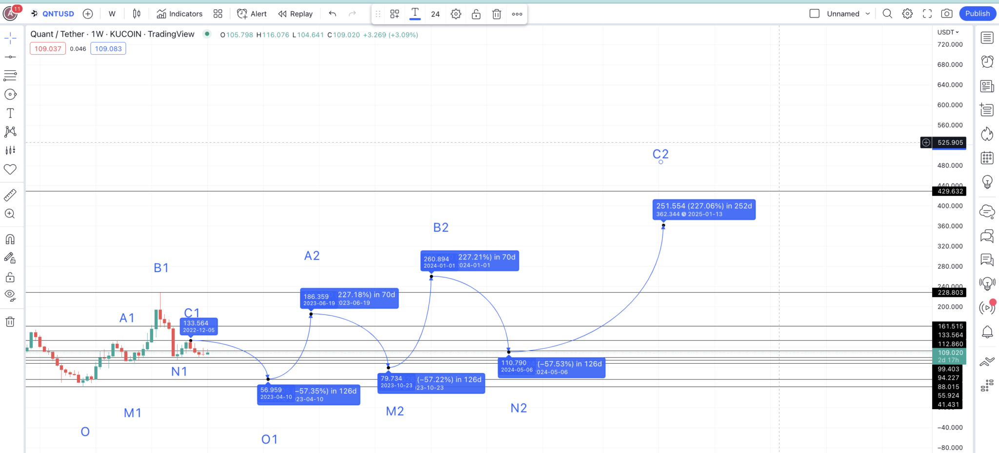 Mức cao tiếp theo, từ N2, có thể đạt gần 362.34 USD nếu chúng ta áp dụng mức tăng giá trung bình là 226.98%, theo bảng trên. Mặc dù mức giá tối đa có thể chỉ xuất hiện vào năm 2024, nhưng mức cao này có thể sẽ bị phá vỡ vào đầu năm 2025. Chúng ta có thể đánh dấu điểm này là C2.