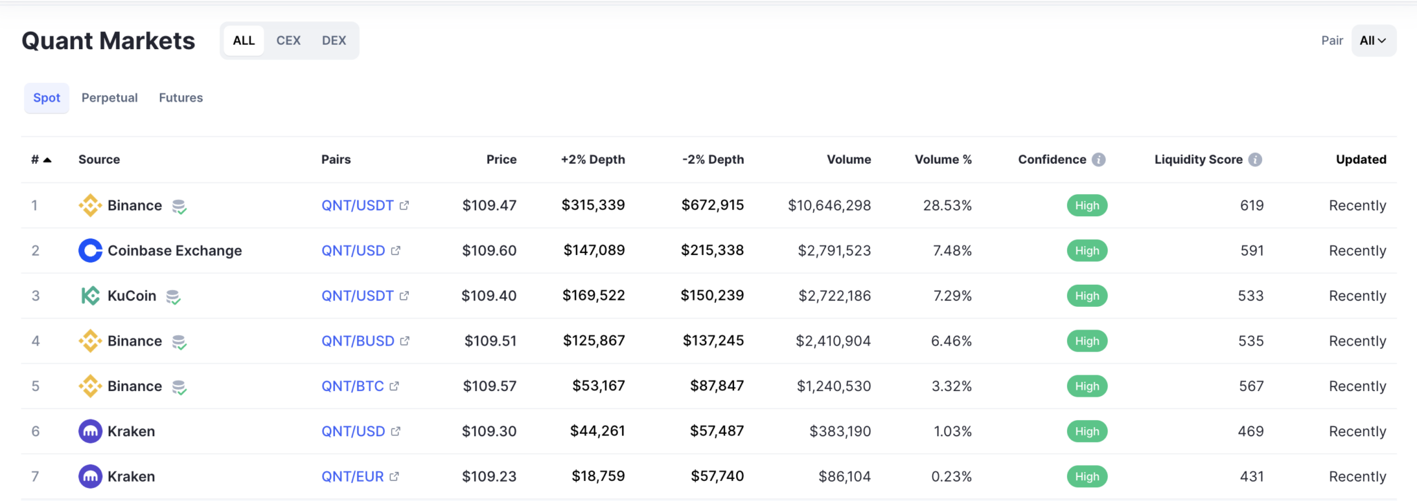 QNT có mức độ tiếp xúc thị trường giao dịch giao ngay tương đối cao, với cặp giao dịch QNT/USDT trên Binance chiếm gần 29% tổng khối lượng. Thanh khoản cao nhờ khối lượng giao dịch 24 giờ khá tốt.