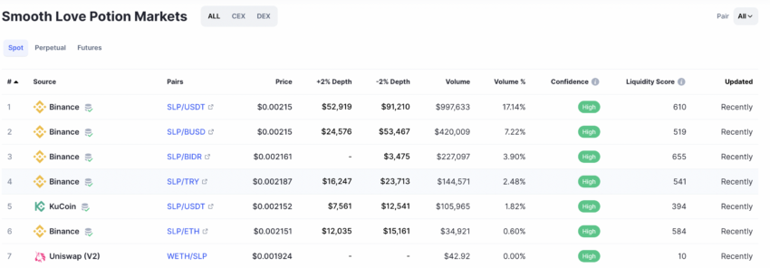 Vốn hóa thị trường của Smooth Love Potion (SLP) đạt đỉnh vào ngày 03/9/2021, với 297.28 triệu USD.