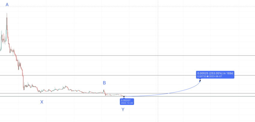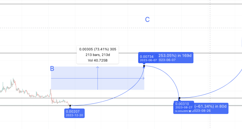 Tính toán dự đoán giá Smooth Love Potion trước đây đặt mức cao nhất năm 2023 là 0.0073 USD. Điểm này được đánh dấu là C, theo các mô hình trước đó. Ngoài ra, lưu ý rằng SLP sẽ phá vỡ mô hình đỉnh xoay chiều vào thời điểm đó vì C cao hơn B. Điều này có nghĩa là chúng ta có thể mong đợi một đợt phục hồi giá.