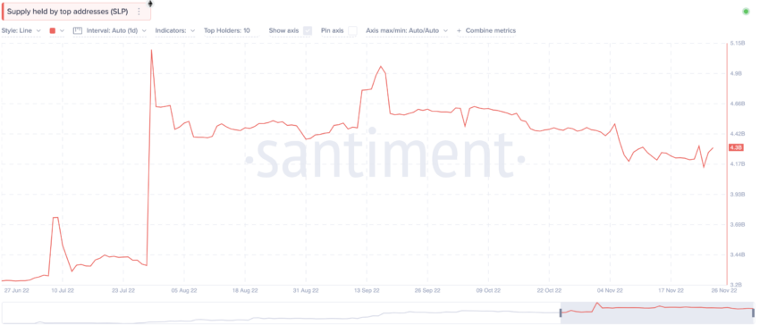 Chỉ số on-chain đầu tiên cần xem xét là phân phối nguồn cung token. Biểu đồ bên dưới cho thấy các địa chỉ hàng đầu nắm giữ token SLP cho đến cuối tháng 11 đã duy trì mức cao và ổn định kể từ tháng Bảy.