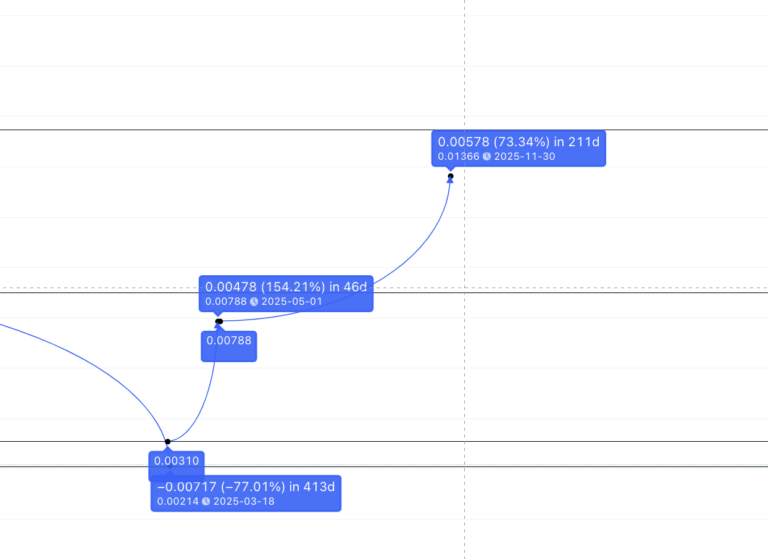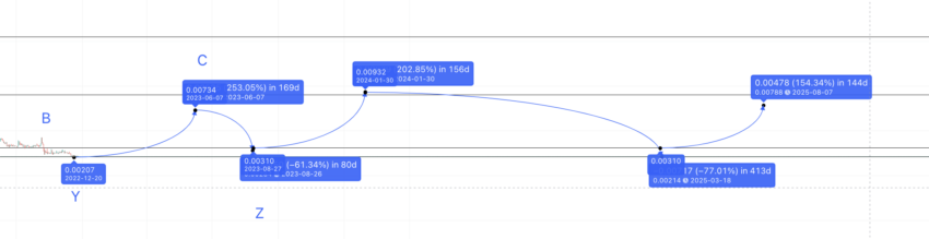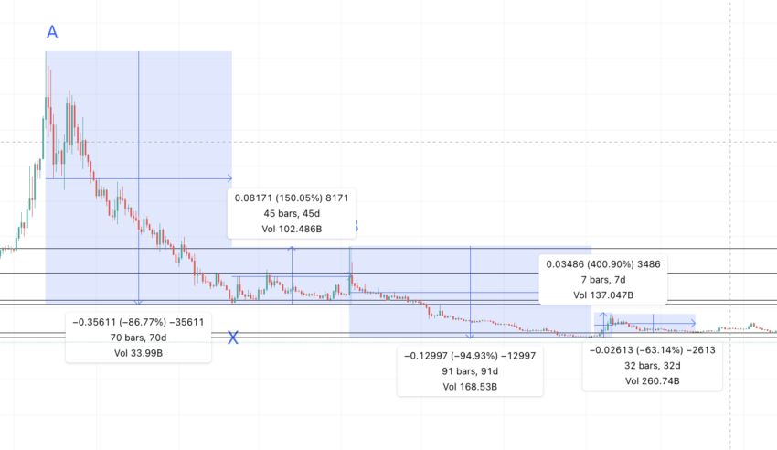 Thời gian tăng gấp 6 lần, trong khi tỷ lệ phần trăm giảm ít nhiều vẫn nhất quán. Do đó, SLP có thể chạm mức thấp tiếp theo trong 420 ngày và ở mức thấp 77.70%, tại 0.00214, chính là điểm X mới. Tuy nhiên, trong một xu hướng tăng, token SLP có thể duy trì tại mức hỗ trợ là 0.00308 USD.